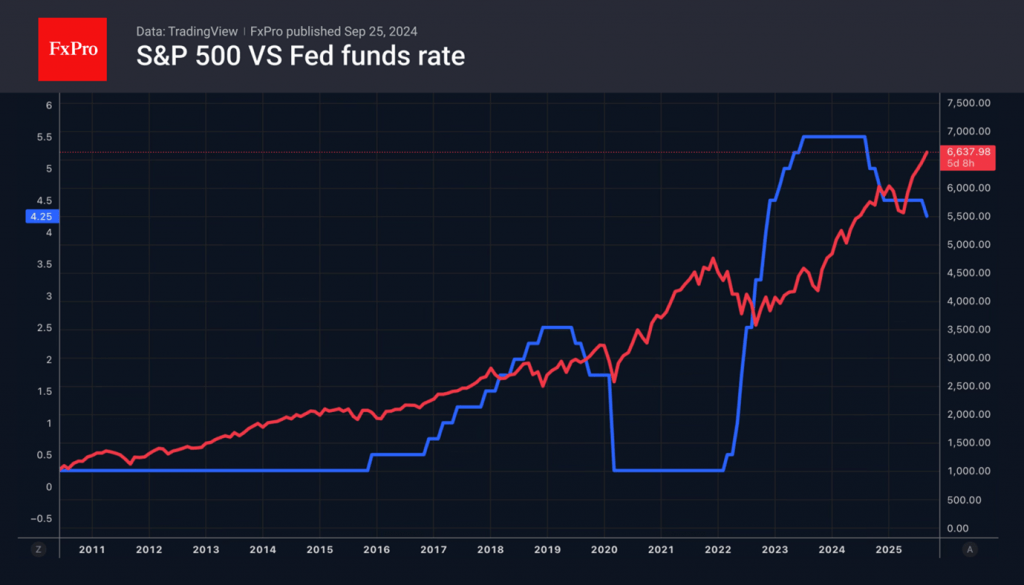 The fall in US stock indices resembles a sell-the-fact after a large-scale buy rumour after the Fed has lowered its rate. After the S&P 500 rose on news of Oracle and NVIDIA’s deals with OpenAI, asset managers bought $58 billion worth of US stocks. This is the largest inflow since the beginning of the year. This seems logical against the backdrop of numerous record highs for the broad stock index.