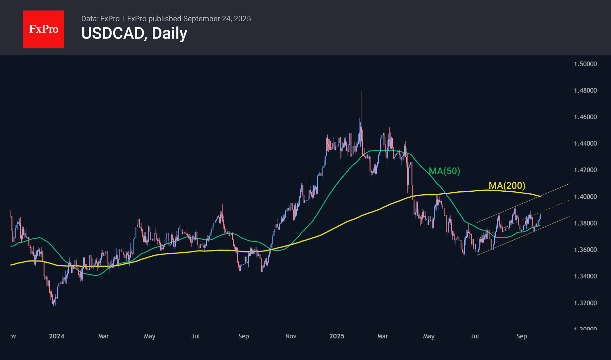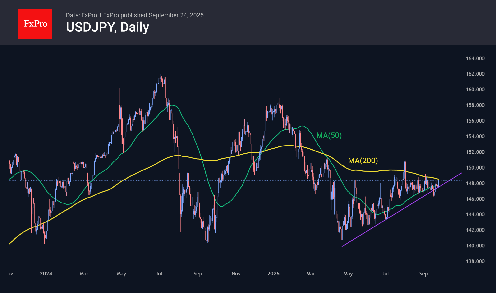 USDJPY is also close to colliding with its 200-day average at 148.3, trading near the area of highs since July. In early September, we saw an attempt by the pair to develop a downtrend, but it was halted by the Bank of Japan’s rather dovish stance and the strengthening of the dollar against the yen after the Fed meeting in the middle of last week. USDJPY remains in an uptrend, supported by the rising trendline from the April and early July lows. An attempt to break below it on 17 September was unsuccessful. A rise above 149 would be an important technical breakthrough, but widespread media and retail trader attention may only come after a rise above 150, repeating the 2024 climb with a potential peak at 158-160.