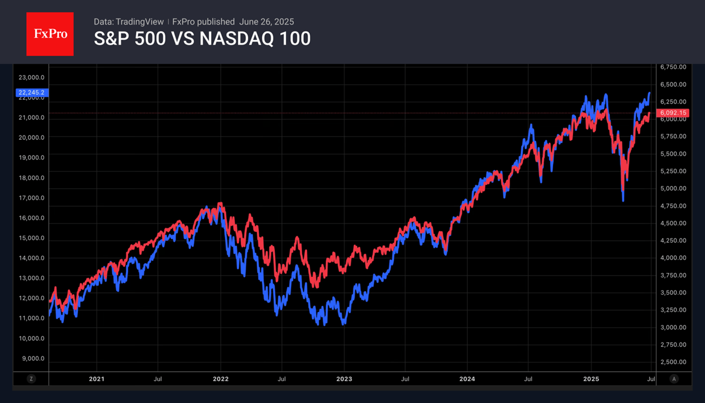 The de-escalation of the conflict in the Middle East brought the S&P 500 closer to record highs. A new wave of interest in artificial intelligence has allowed the Nasdaq 100 to update its historical peaks. The growth of US stock indices at the end of June is being called a rally of tech giants. NVIDIA has surpassed Microsoft in terms of market capitalisation, again becoming the most expensive company in the world.