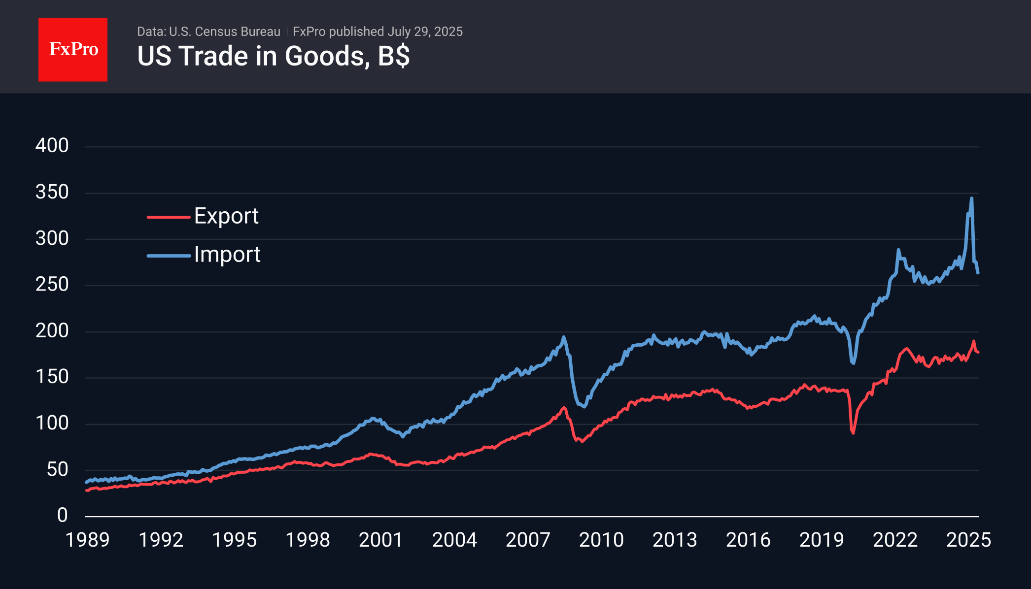 Now, imports are returning after their surge, but their June volume of $264 billion is the lowest since March last year, and it is still too early to talk about a reversal of the long-term growth trend. Exports continue to show a long-term trend of gradual growth, although they lost 0.6% last month.