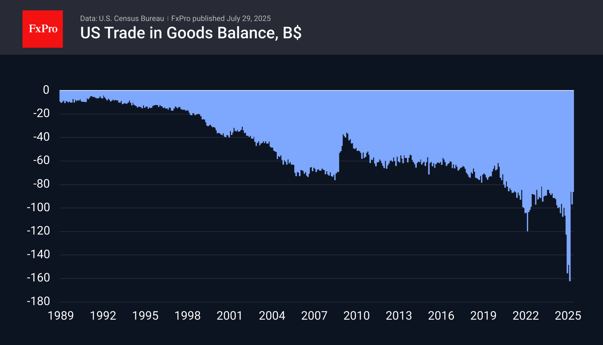 Due to a decline in imports, the US trade deficit narrowed in June to $86 billion, down from $96.4 billion a month earlier and a peak of $162 billion in March. Anticipating trade disputes, US importers began to increase purchases sharply in December. However, even without this, the deficit hovered near a record $100 billion per month throughout the second half of 2024.