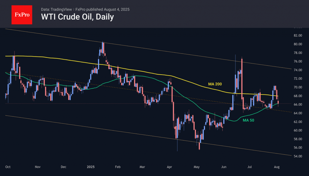 Oil has been under triple pressure since the end of last week, losing more than 7% per barrel of WTI since 31 July, reaching the important psychological level of $65. The latest wave of oil sell-offs began with the realisation that US trade tariffs from August will be higher than initially expected, as higher tariffs are associated with an economic slowdown and weaker demand for energy. Fears of an economic slowdown intensified after the release of unexpectedly weak US employment data on Friday. Over the weekend, concerns were heightened by OPEC+’s increase in production quotas, which was reflected in the markets on Monday.