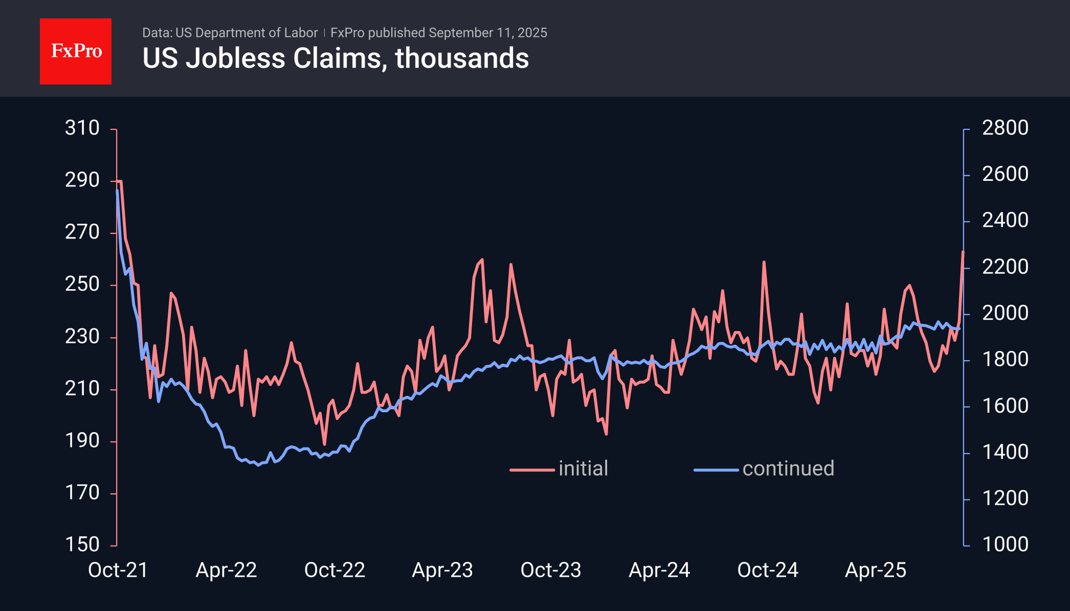 Another worrying labour market indicator is the surge in weekly jobless claims to 263,000, the highest in almost four years. Such data will likely finally switch the Fed into a mode of consistent rate cuts in an attempt to keep the economy from falling into recession. This is bad news for the dollar, but at this stage, it is quite good for stocks, as there have been no signs of a noticeable decline in consumption so far, only caution due to tariff uncertainty.