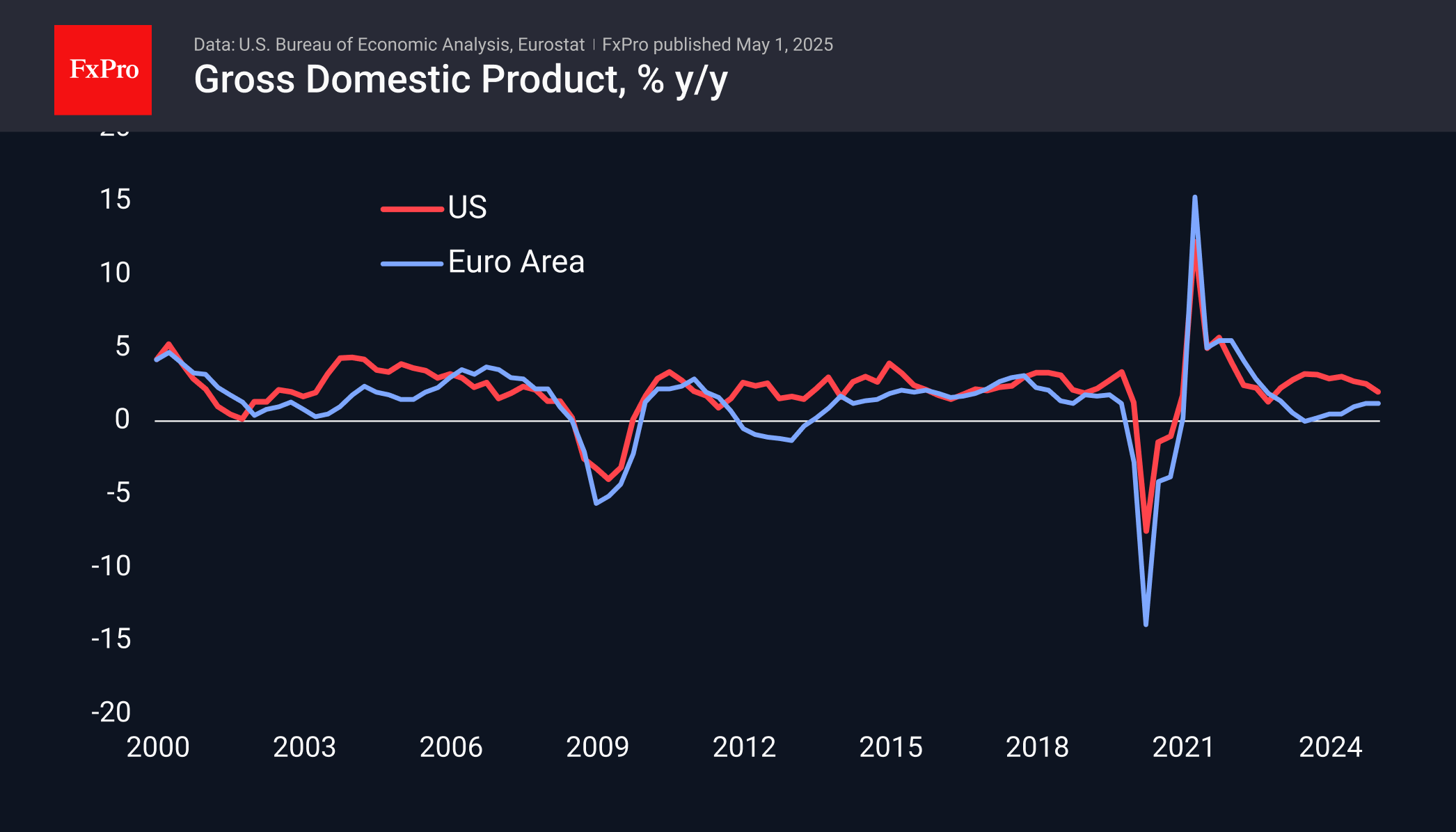 According to the first estimate, the US economy contracted by 0.3% in annualised terms in the first quarter (change from the previous quarter multiplied by 4). The figure initially sent shockwaves through the markets, as the average forecast had pointed to a 0.4% rise in the economy, down from the previous 2.4%. The figures sparked a sell-off in equity markets, prompting speculation that the economy is already facing the harsh effects of tariff disputes.