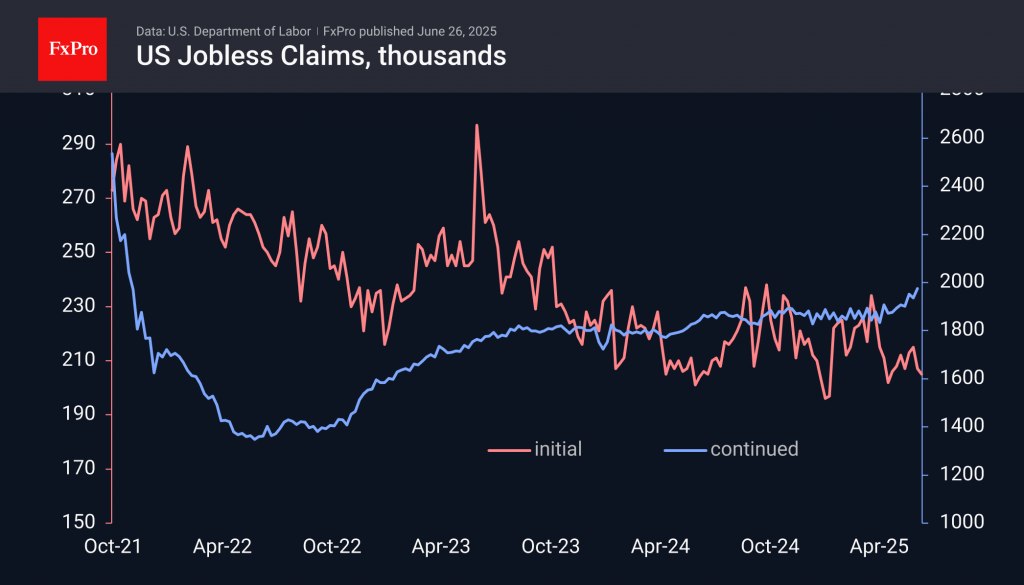 Weekly benefit claims indicate a deteriorating labour market. The number of repeat claims rose by 37K in the week ending 14 June (latest data) to 1.974 million, reaching its highest level since November 2021. The plateau in this indicator in mid-April was replaced by an upward trend, adding a total of 141K.