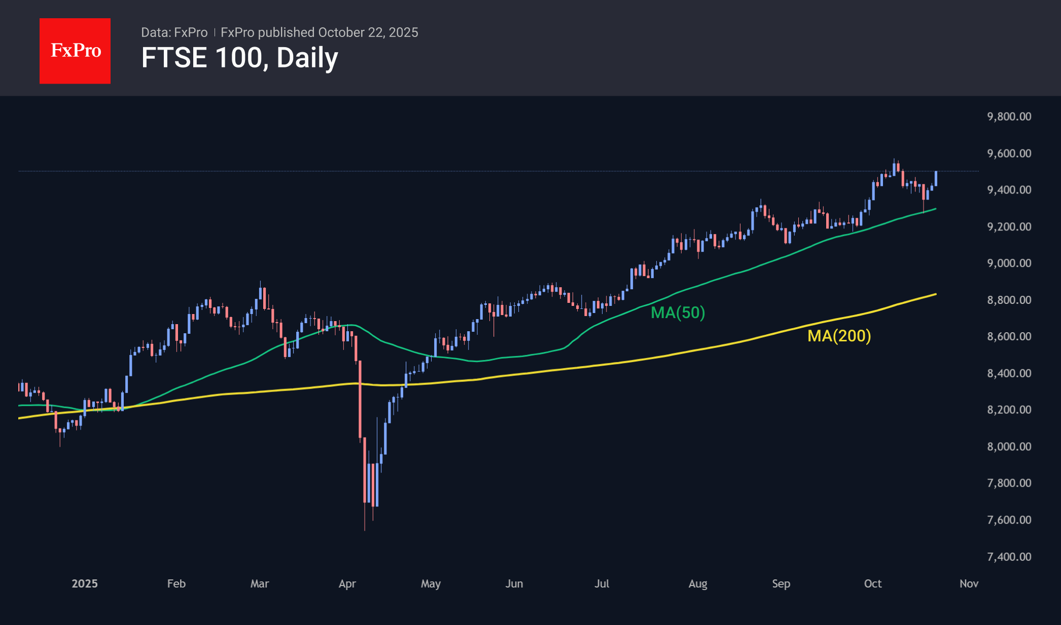 The British market, represented by the FTSE 100, has gained 1% since the start of the day, with 0.9 percentage points of this increase occurring after the publication. The index has returned to territory above 9500, above which it closed only once on October 8th. At the end of last week, the market turned sharply upward after touching the 50-day moving average, which has been acting as support since May. The pound’s weakness supports the stock market, linked to growing expectations of monetary policy easing. The British index is only 1% away from its historic highs and could move to renew them as early as this week.
