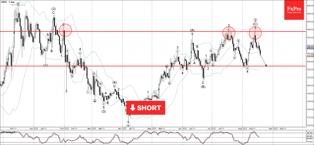 Aave cryptocurrency can be expected to fall to the next support level 248.5 (which stopped the previous wave 4).