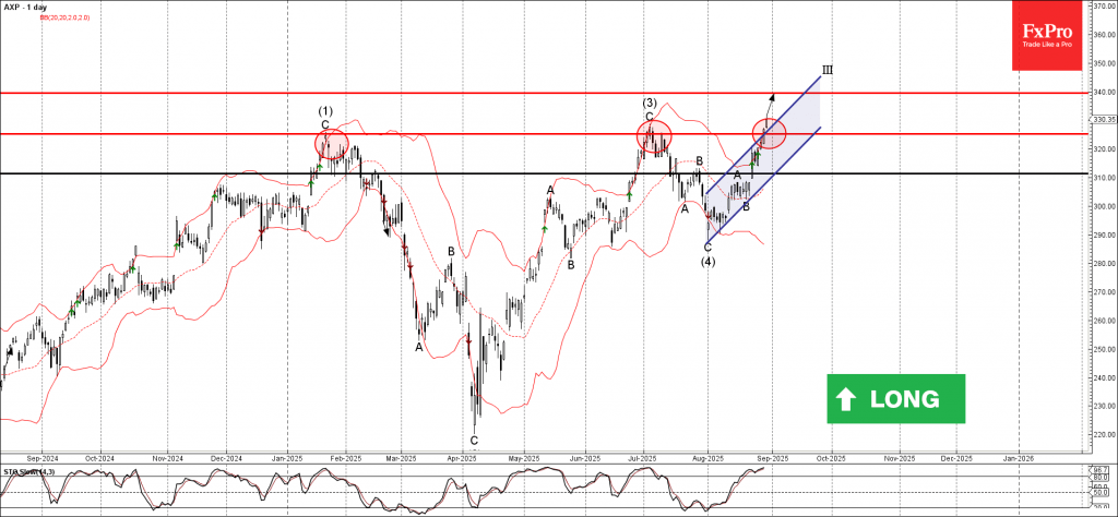 American Express recently broke the resistance zone between the resistance level 325.00 (which has been reversing the price from the start of 2025) and the resistance trendline of the daily up channel from July.