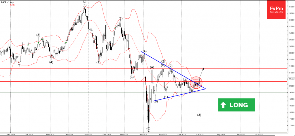 Apple recently broke the resistance zone between the resistance level 203.00 (which has been reversing the price from the start of June) and the resistance trendline of the daily Triangle from March.