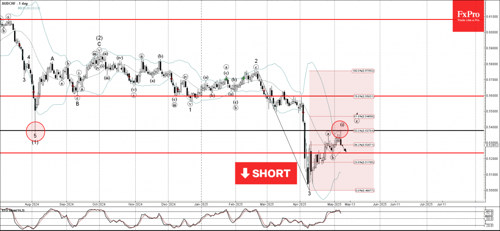 AUDCHF currency pair recently reversed down from the resistance area between the major resistance level 0.5375 (former multi-month low from last August), the upper daily Bollinger Band and the 50% Fibonacci correction of the downward impulse from February.