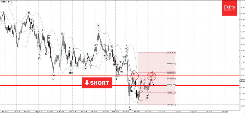 Brent crude oil recently reversed down from the resistance area between the key resistance level 67.80 (which stopped wave (2) in the middle of April), upper daily Bollinger Band and the 61.8% Fibonacci correction of the downward impulse from January.