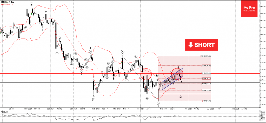 Given the clear daily downtrend, Comcast can be expected to fall to the next support level 34.00 (low of the previous minor correction (b)).