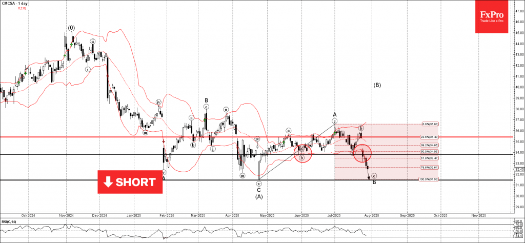 Given the clear daily downtrend, Comcast can be expected to fall further to the next support level 31.45 (former multi-month low from April).
