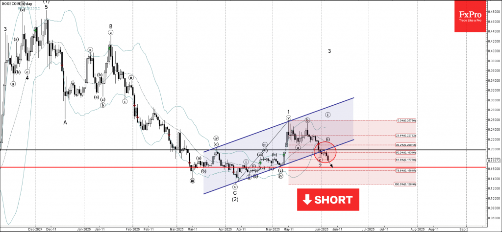 Dogecoin cryptocurrency can be expected to fall to the next support level 0.1600, former low of wave (iv) from the start of May.