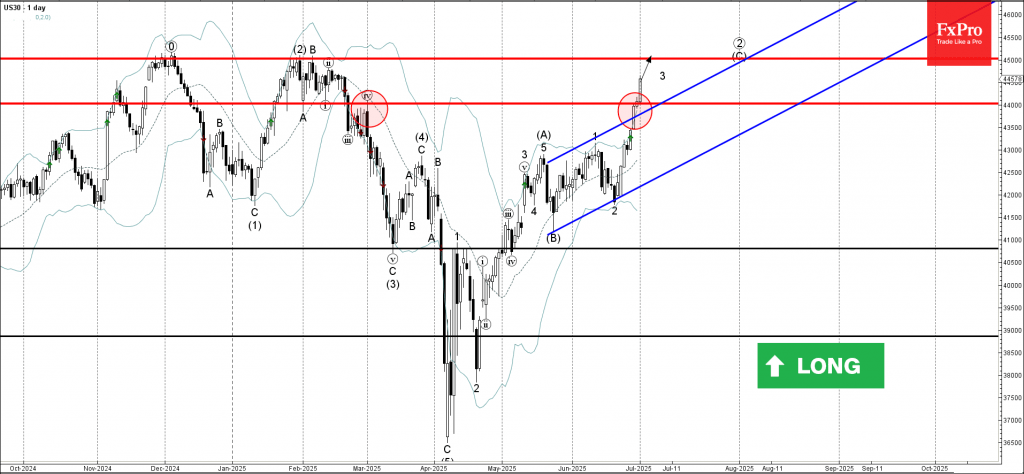 Dow Jones index recently broke the resistance zone located at the intersection of the resistance level 44000.00 (former top of wave iv from March) and the resistance trendline of the daily up channel from May.