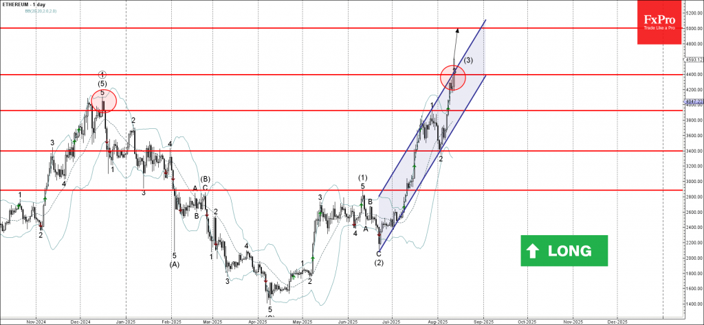 Ethereum continues to rise inside the sharp upward impulse wave (3), which previously broke the resistance zone between the resistance level 4400.00 and the resistance trendline of the daily up channel from June.