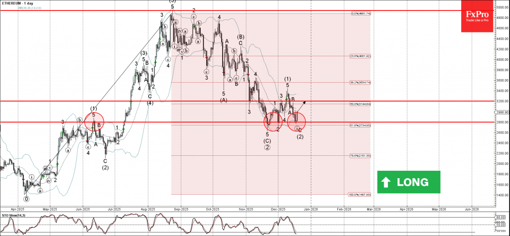 Ethereum cryptocurrency recently reversed from the support area between the strong support level 2800.00 (former resistance from June, which has been reversing the price from November) and the lower daily Bollinger Band.