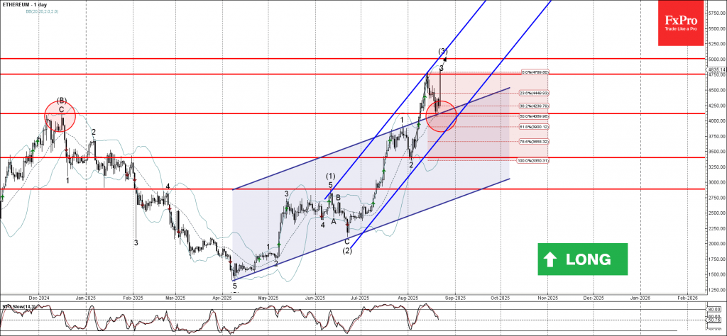 Ethereum cryptocurrency recently reversed up from the support area between the support level 4115.00 (former multi-month high from December), upper trendline of the recently broken up channel from June and the 50% Fibonacci correction of the upward impulse from the start of August.