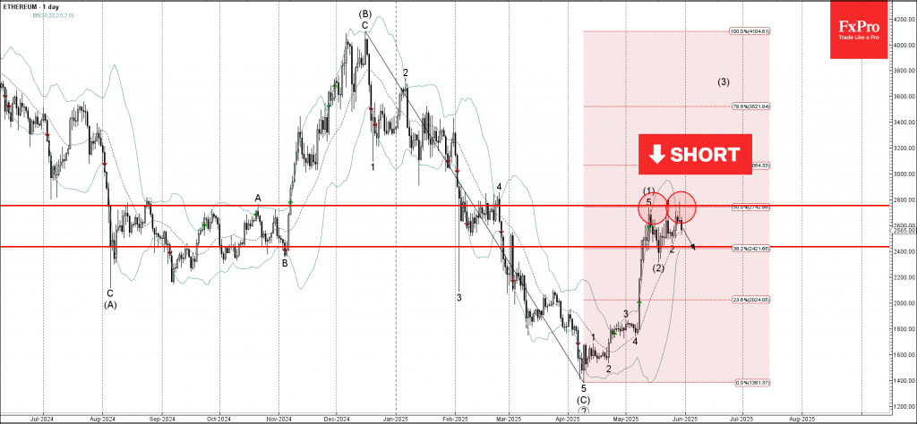 Ethereum cryptocurrency can be expected to fall to the next support level 2400.00 (which stopped the previous wave (2) earlier in May).