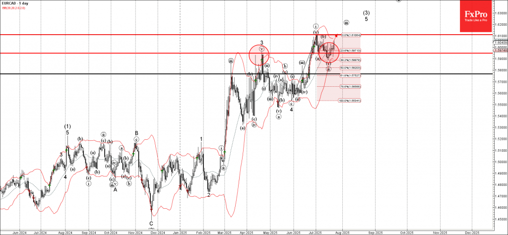 Given the overriding daily uptrend, EURCAD currency pair can be expected to rise to the next resistance level 1.6100 (which stopped the previous impulse wave i in June).
