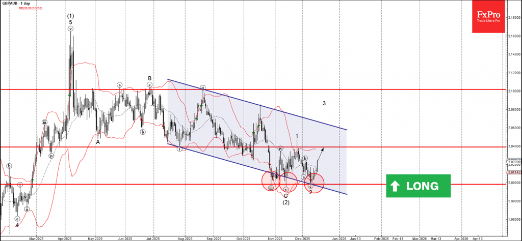 GBPAUD currency pair recently reversed up from the support area between the round support level 2.000 (which has been reversing the price from October, as can be seen below), lower daily Bollinger Band and the support trendline of the down channel from July.