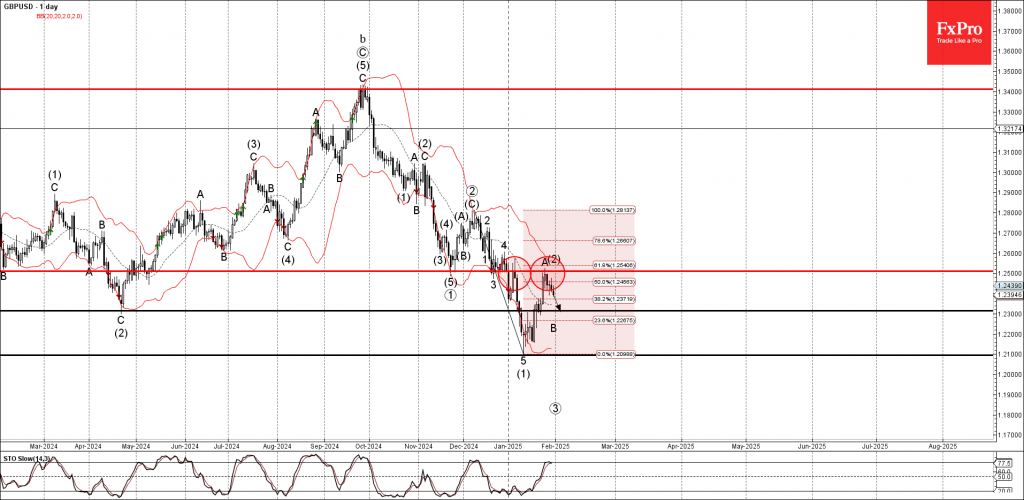 GBPUSD currency pair can be expected to fall further toward the next support level at 1.2300 (the target price for the completion of the active minor correction B).
