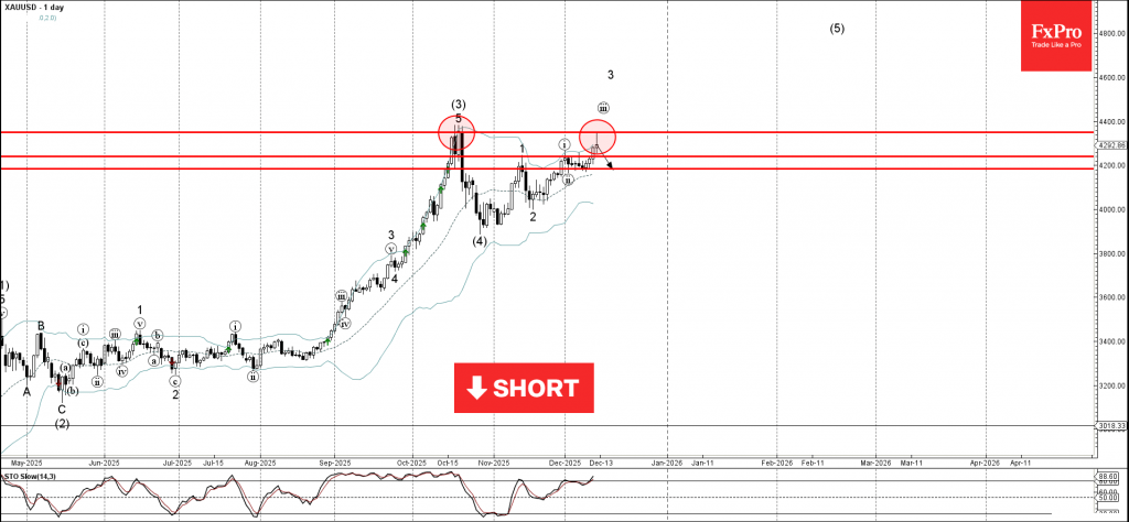 Gold recently reversed from the resistance area between the strong resistance level 4350.00 (which stopped sharp wave (3) in October) and the upper daily Bollinger Band.