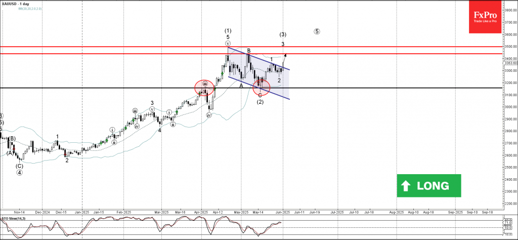 Given the clear daily uptrend, Gold can be expected to rise to the next resistance level 3440.00 (top of the B-wave from May).