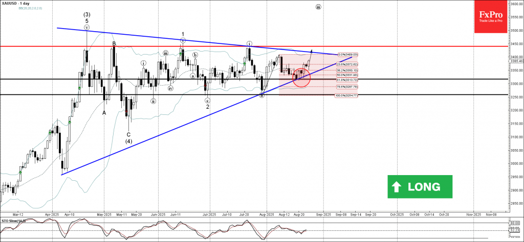 The upward reversal from the support level 3315.continues the active short-term impulse wave iii of the higher order impulse waves 3 and (5), from May.