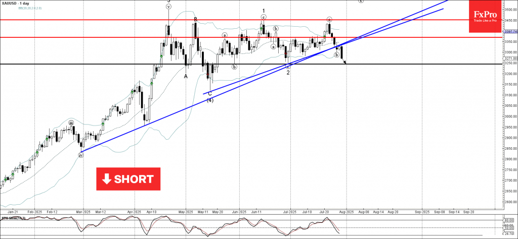 Gold can be expected to fall further to the next round support level 3250.00 (former low of waves 2 and (b) from May and June).