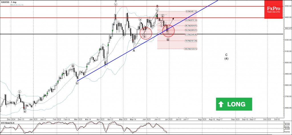 Gold recently reversed up from the support level 3250.00 (which stopped wave (b) at the end of May, as can be seen from the daily Gold chart below) intersecting with the lower daily Bollinger Band and the 50% Fibonacci correction of the upward impulse from May.