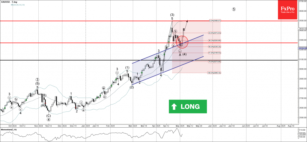 Gold recently reversed up the support area between the support level 3270,00 (low of the previous correction a), 20–day moving average and the 50% Fibonacci correction of the upward impulse 5 from April.