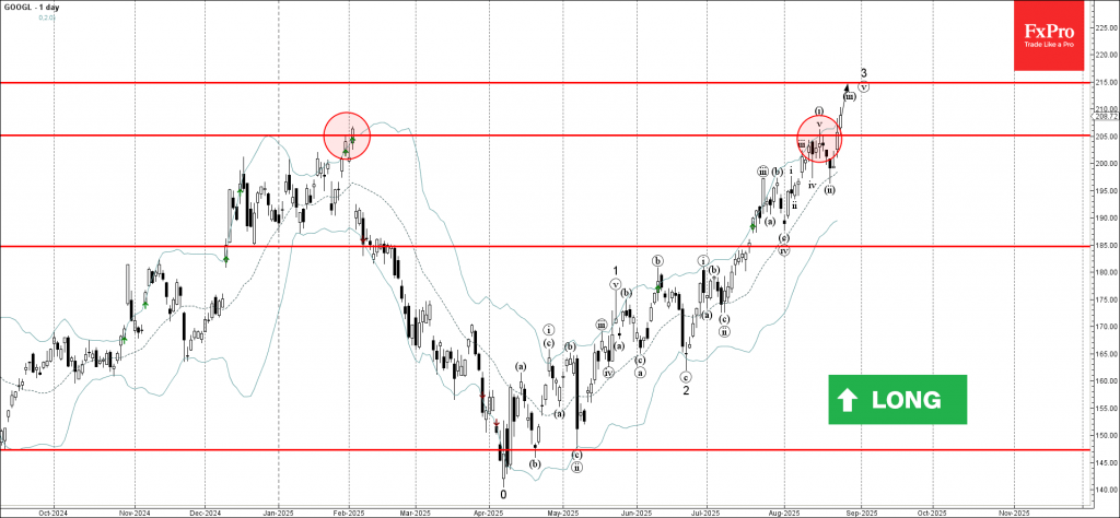 Given the strong daily uptrend, GOOGL can be expected to rise to the next resistance level 215.00 (target price for the completion of the active impulse wave 3).