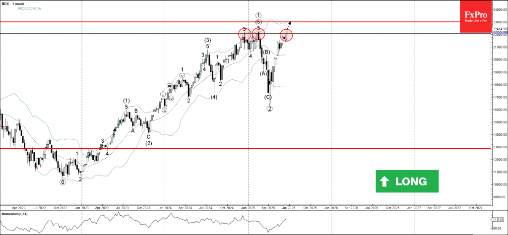 Nasdaq-100 index recently broke above the major resistance level 22100.00 (which has been steadily reversing the index from the end of 2024 as can be seen from the weekly NDX chart below).