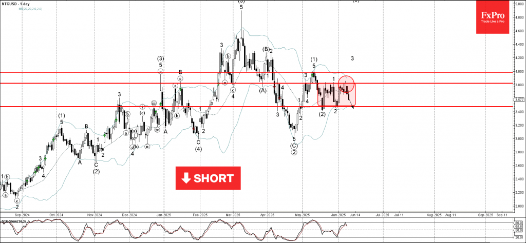 Given the strong daily downtrend, Natural Gas can be expected to fall to the next support level 3.50 (lower border of the active price range, low of waves (2) and 2).