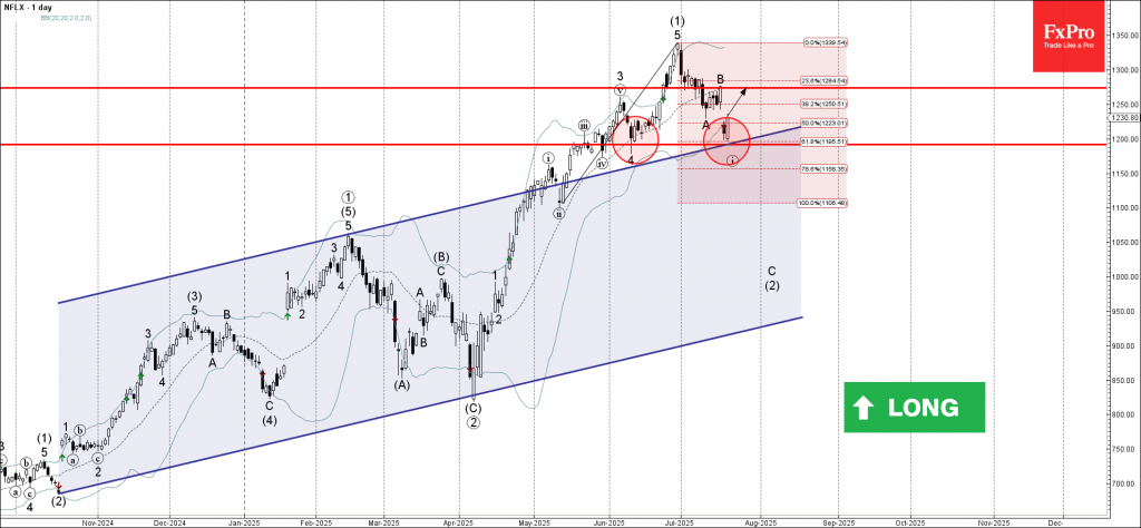 Given the strong daily uptrend, Netflix can be expected to rise further to the next resistance level 1275.00 (top of the minor correction B).