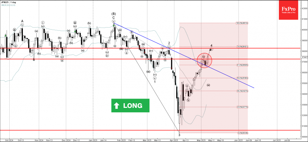 Nikkei 225 index can be expected to rise to the next resistance level 38275,00 (former monthly high from March and the target for the completion of the active impulse wave c).
