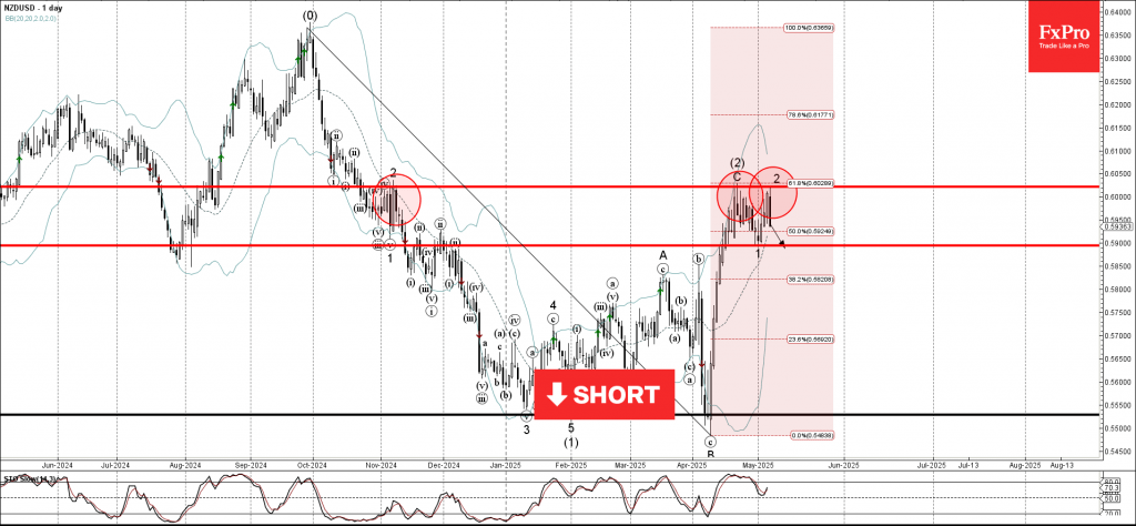 NZDUSD currency pair recently reversed down from the resistance zone between the key resistance level 0.6020 (which has been reversing the price from November), the upper daily Bollinger Band and the 61.8% Fibonacci correction of the downward impulse from September.