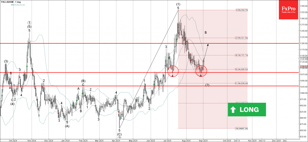 Palladium recently reversed up from the support zone between the key support level 1075.00 (low of the previous wave A), 50% Fibonacci correction of the sharp upward impulse from April and the lower daily Bollinger Band.