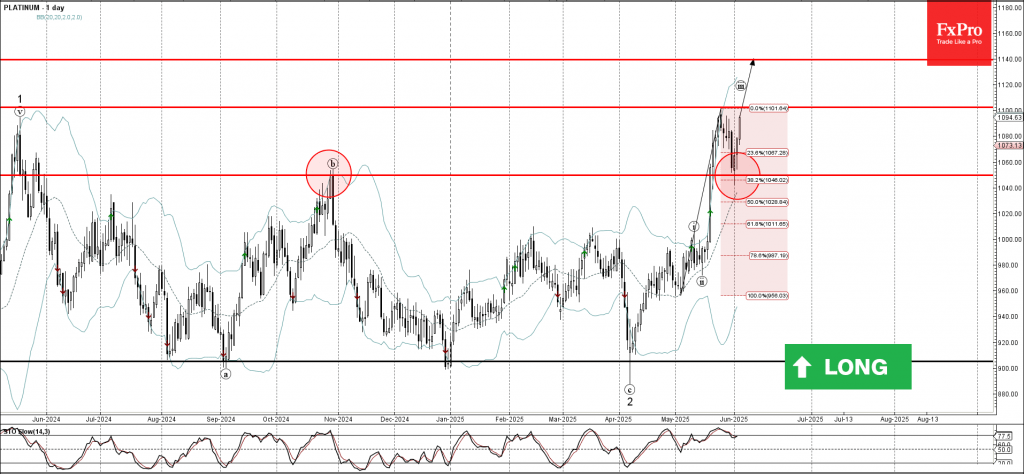 Platinum can be expected to rise to the next resistance level 1100.00, the breakout of which can lead to further gains toward 1140.00.