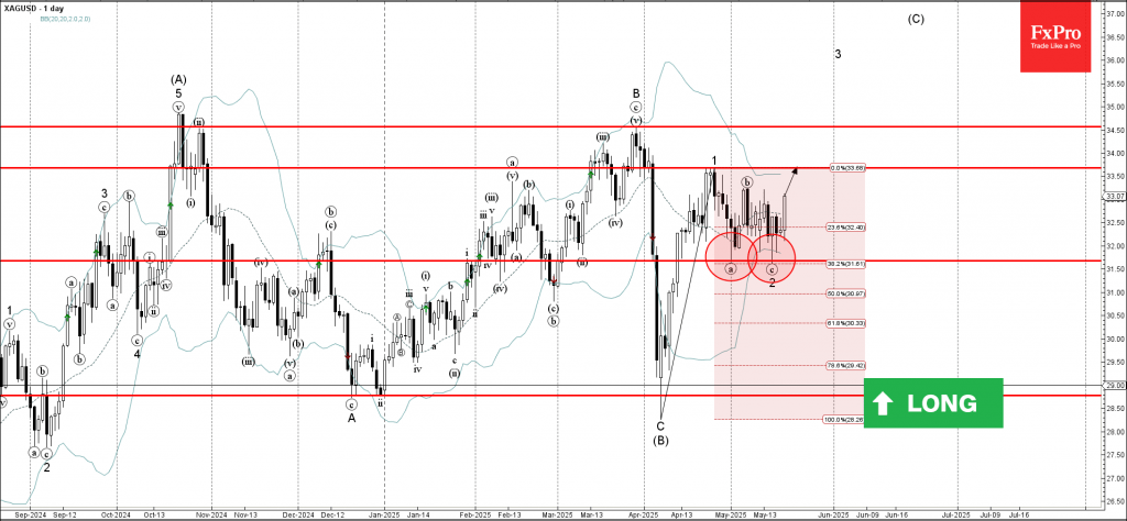 Silver can be expected to rise to the next resistance level 33.50 (which stopped the previous minor impulse wave 1).