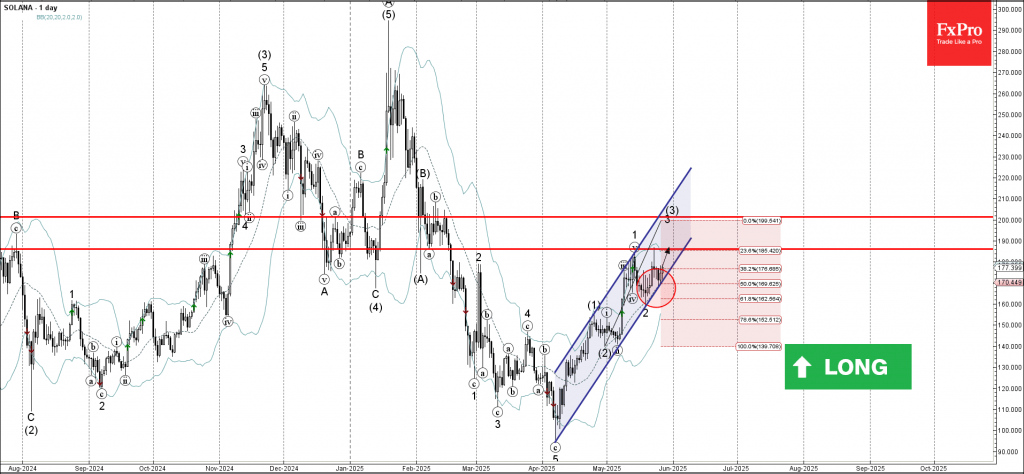 Solana cryptocurrency can be expected to rise to the next resistance level 186.10, which stopped the previous impulse wave 1 in the middle of May.