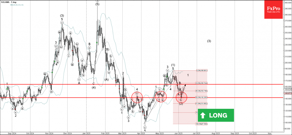 Solana cryptocurrency recently reversed up from the support zone between the key support level 141.65 (which has been reversing the price from April), lower daily Bollinger Band and the 50% Fibonacci correction of the upward impulse (1) from April.
