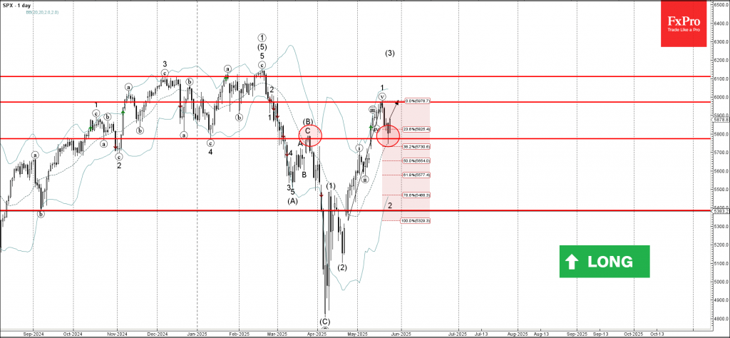 S&P 500 index can be expected to rise to the next resistance level 5970,00, top of the previous minor impulse wave 1 from the middle of May.