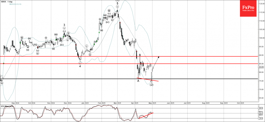 Starbucks recently reversed up from the support zone between the key support level 76.20 (which stopped the previous wave A at the start of April) and the lower daily Bollinger Band.