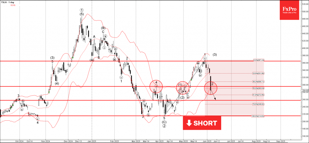 Tesla recently broke the support zone located between the support level 294.00 (former resistance from April and March) and the 50% Fibonacci correction of the upward impulse from April.