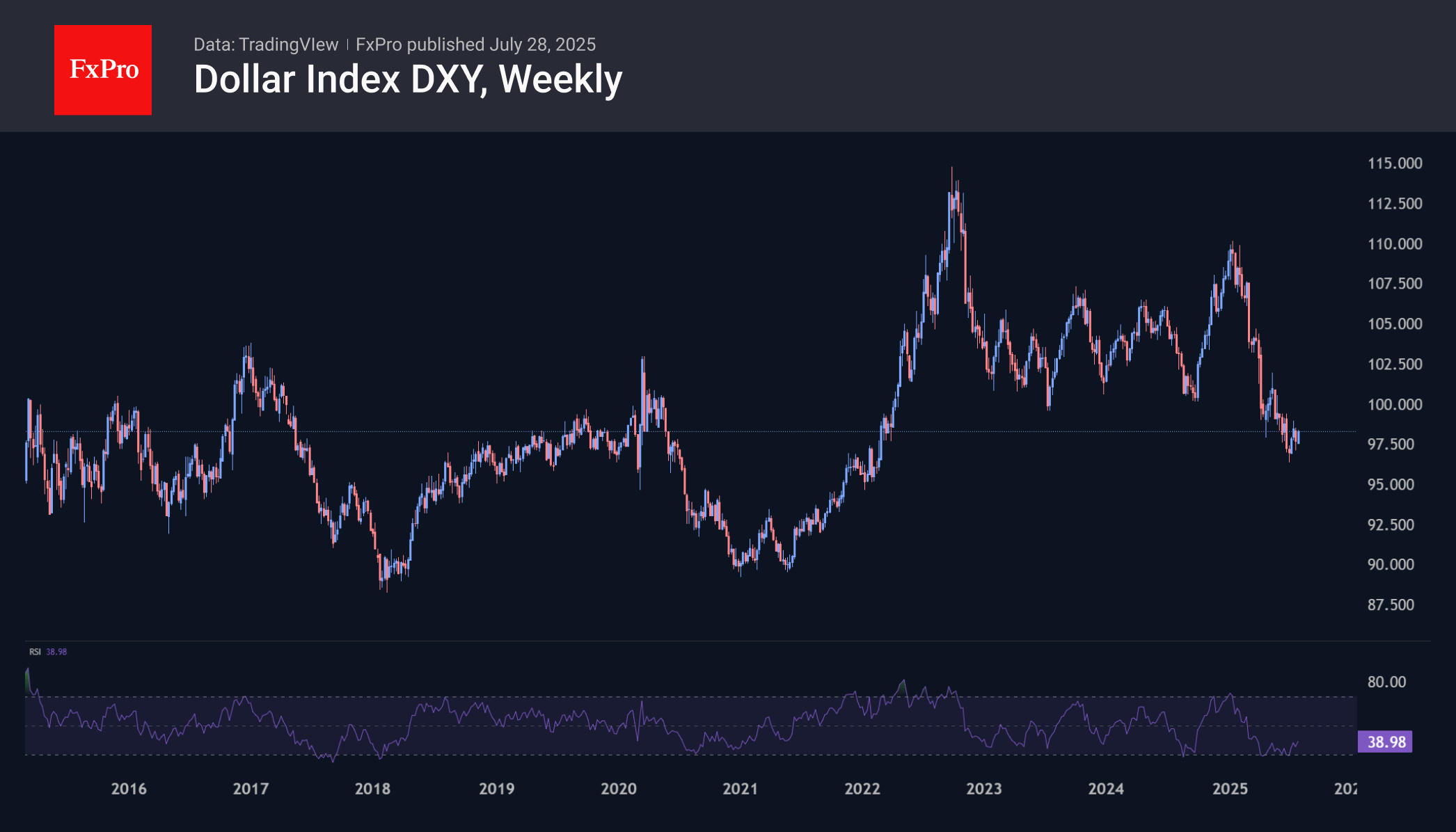 The US dollar is up 0.75% against the euro and 0.5% against a trade-weighted basket of developed country currencies. The euro took a hit after the trade agreement between the EU and the US. The agreement shifts the balance of cash flow towards the US, which benefits both the dollar and the stock markets. At the same time, there has been a noticeable sigh of relief driven by growing confidence in the future, albeit tempered by the unpredictability of the US president.