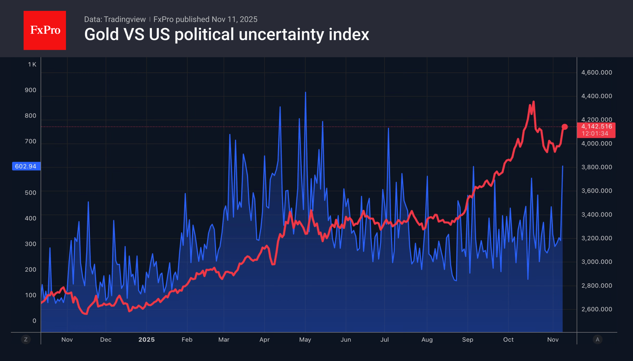 The Supreme Court, with its scepticism about the legality of tariffs, has allowed the shiny metal to find its footing. Steps to end the shutdown triggered the rebound from the recent low, and the US government shutdown made the Fed cautious. The central bank doubted the need to cut the federal funds rate at the end of the year. The resumption of US macroeconomic data publication will provide it with the necessary information and enable it to act.