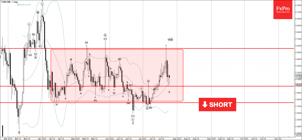 Given the strongly bearish crypto sentiment seen today, Toncoin cryptocurrency can be expected to fall to the next round support level 3.0000 (former resistance from the start of July).