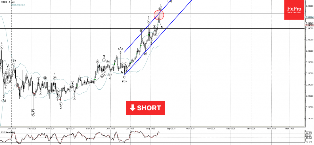 Given the strongly bearish sentiment seen across the crypto markets today and the overbought daily Stochastic, Tron cryptocurrency can be expected to fall to the next support level 0.3400.